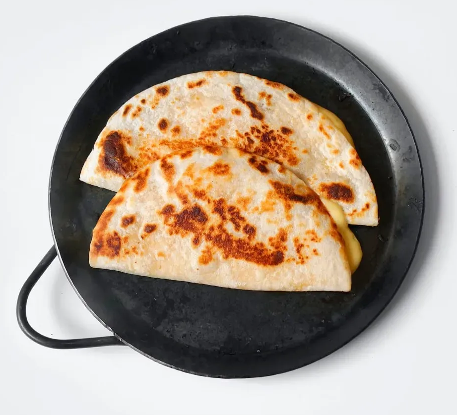 Яйца взбить, добавить соль. Вылить на раскаленную сковороду и тут же сверху положить лепешку тортильяс. Слегка поджарить и перевернуть. Выложить слоями нарезанный свиной карбонад, помидоры, сыр на одну половину тортильяс. Второй половиной накрыть и подержать на сковороде пару минут.